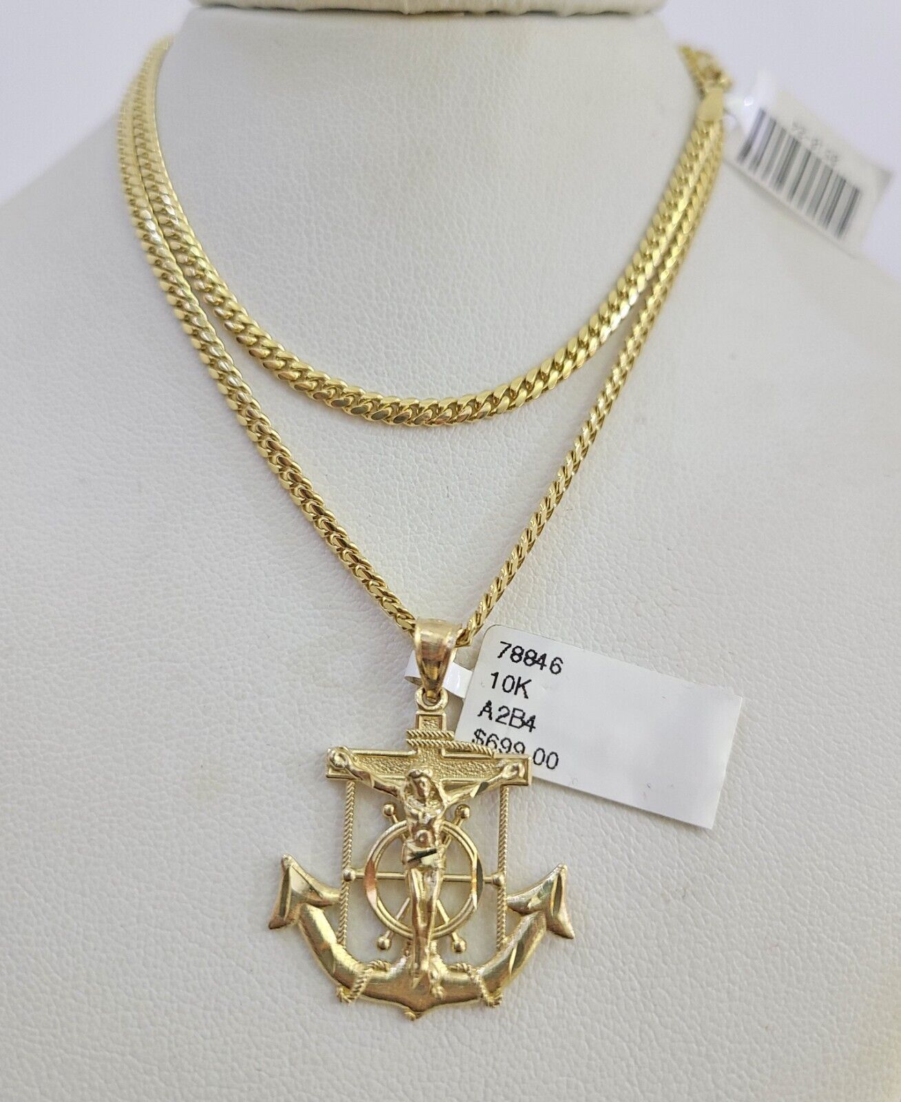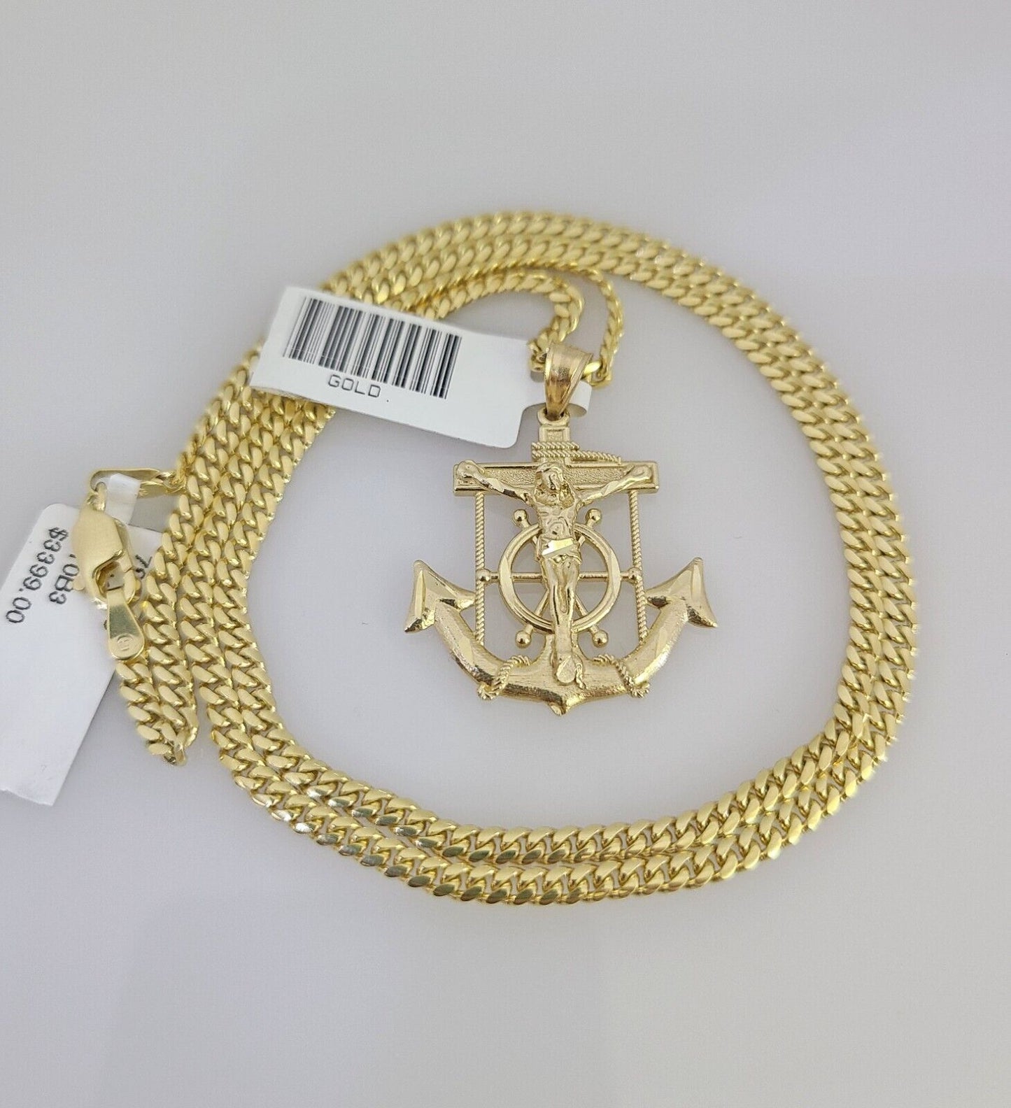 Is Presenting You with This Absolutely Stunning Real 10k Yellow Gold Solid Miami Cuban Chain 2.5mm, 18-24 Inches with Jesus Anchor Charm, Lobster Lock. The links are 10K GOLD and are very strong. These Beautiful Chains will not tarnish, discolor, or fade because they are Pure 10K Gold. We also have them in various another length. Please feel free to contact us if you have any queries regarding the item. 20"-A10B3 A2B4 Cal