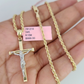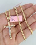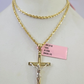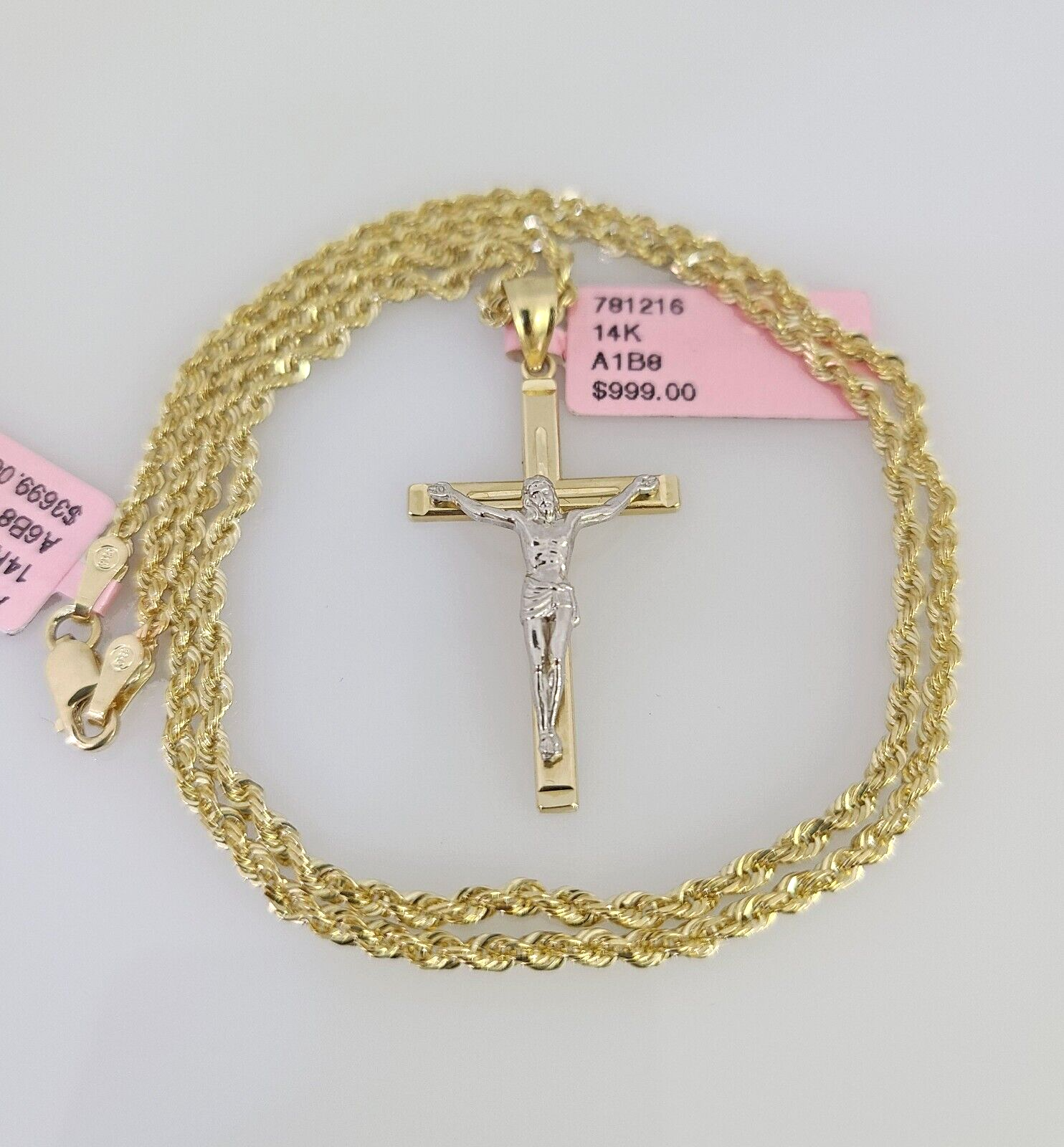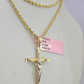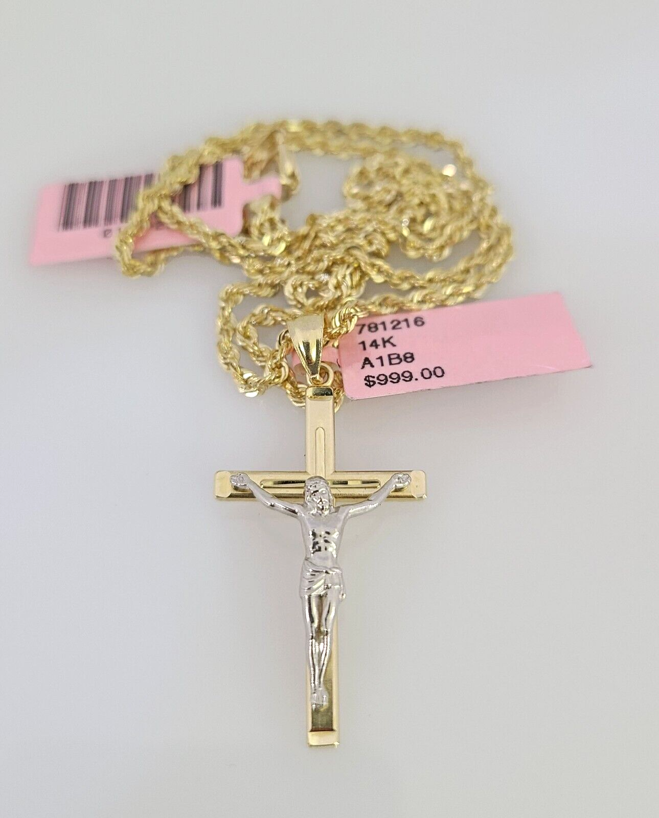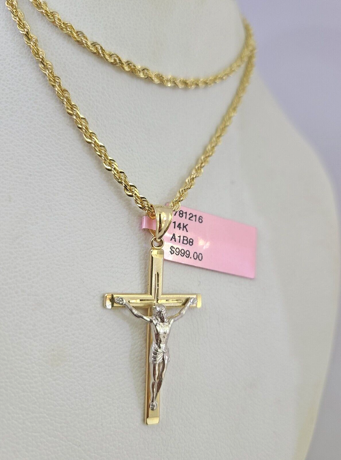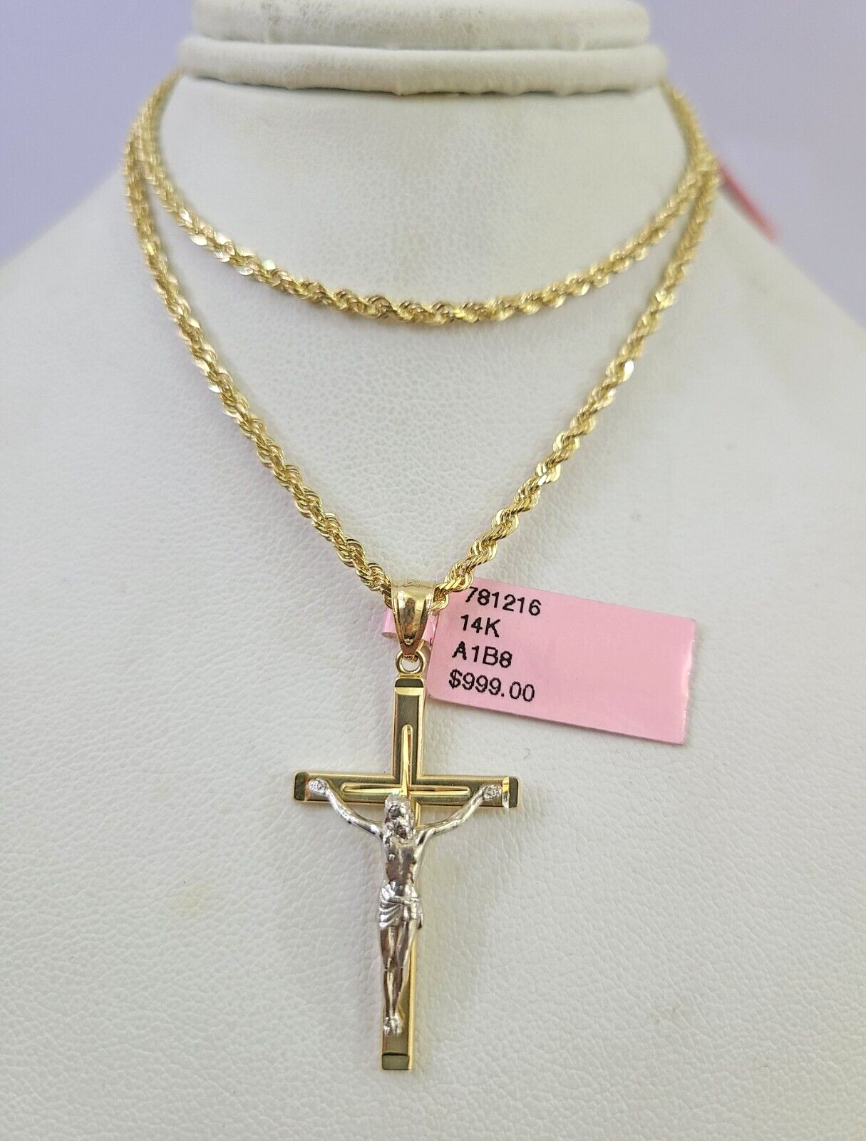 14k Solid Rope Chain 2mm Jesus Cross Pendant Charm Gold 18"-24" SET Necklace