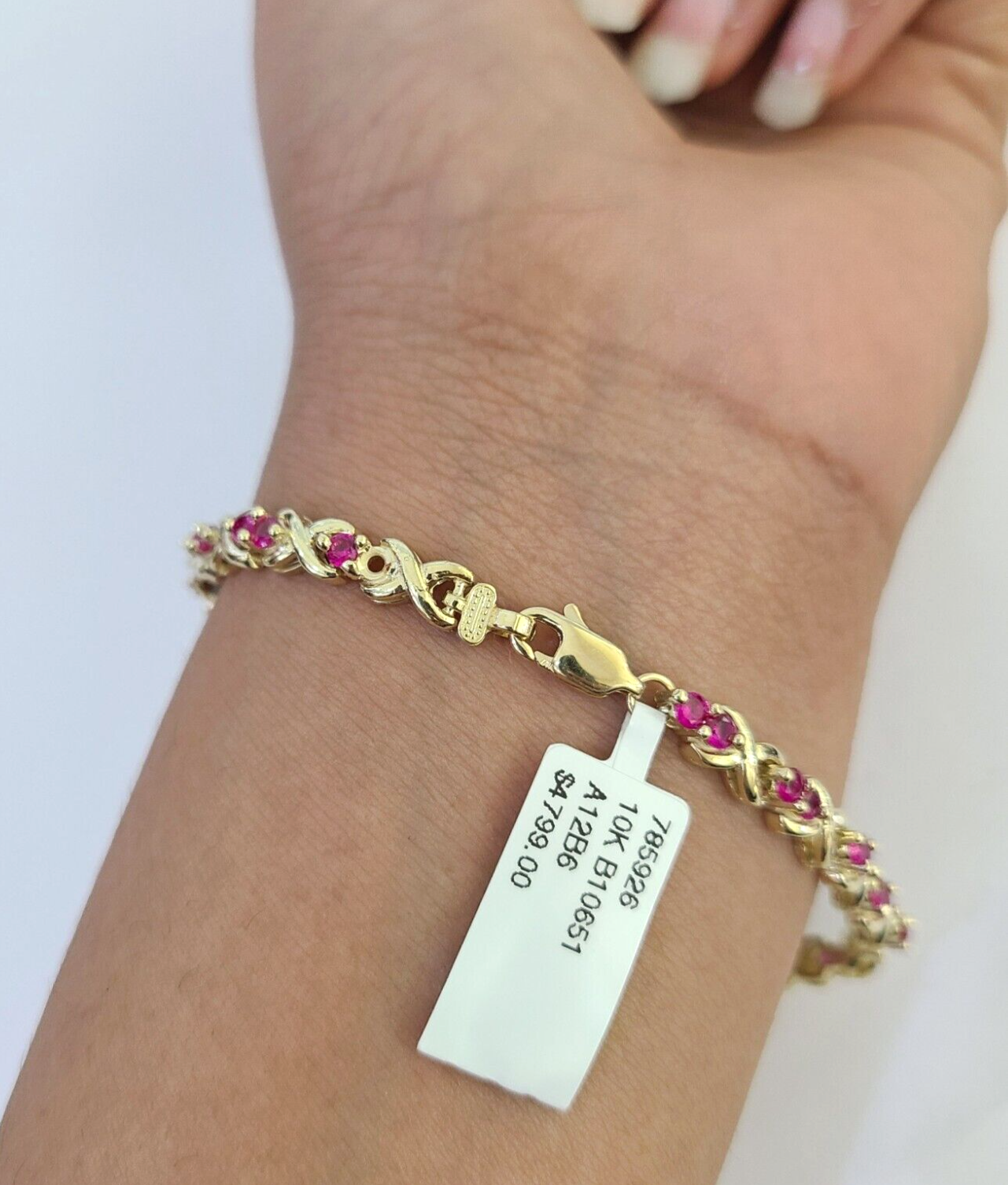 Is Presenting You with This Absolutely Stunning Real 10k Yellow Gold Pink Tennis Bracelet 4mm, 7.5 Inches, Lobster Lock. These Beautiful bracelets will not tarnish, discolor, or fade because they are Pure 10K Gold. We also have them in various another length. Please feel free to contact us if you have any queries regarding the item.
